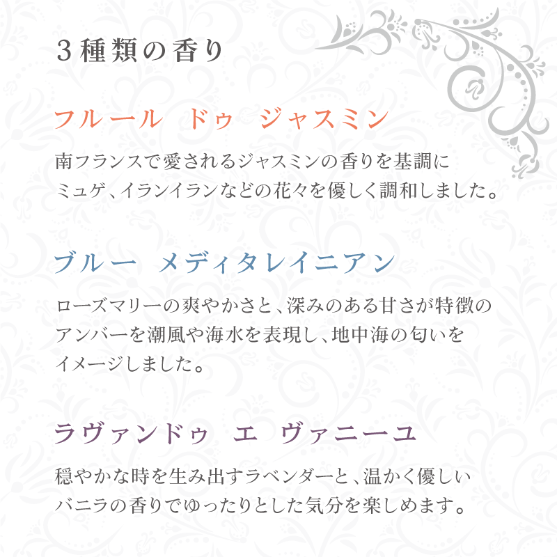 アンボメーがお届けする華やかな3種類の香り(写真4枚目)をお楽しみください。